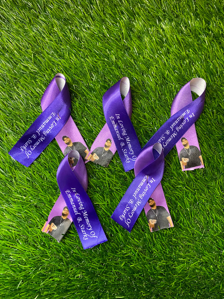 Memorial Ribbon are printed to contain a picture and any wording you desired. Ribbons are $2 each with a minimum of 10 to order. Please upload photo, desired wording and color scheme. A proof will be emailed within 24 hours and ribbons are ready for pickup within 3 days.
